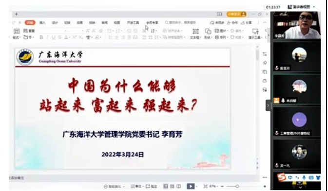 党委书记李育芳以“中国为什么能够站起来、富起来、强起来”为题,从新民主主义革命和新中国成立、完成社会主义改造和全面开启社会主义建设、改革开放40年、中国特色社会主义新时代四个阶段,回顾建党百年来奋斗的历程和取得的伟大成就,与同学们共同学习中国共产党为什么“能”、马克思主义为什么“行”、中国特色社会主义为什么“好”、中国为什么能够成功,勉励同学们要爱党爱国、志存高远、砥砺前行,希望正处在新时代的同学们要积极面向未来、主动担当社会大任,为实现中华民族伟大复兴而努力奋斗。