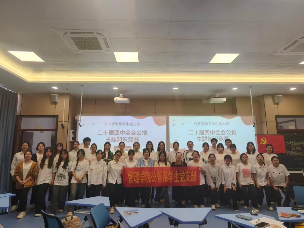 为深入学习党的二十届四中全会精神,引导员工党员深刻把握中国式现代化建设的战略部署,2025年12月19日,304永利集团公共管理系员工党支部在智慧教室博文楼B101举办以“学习党的二十届四中全会精神”为主题的知识竞赛活动。