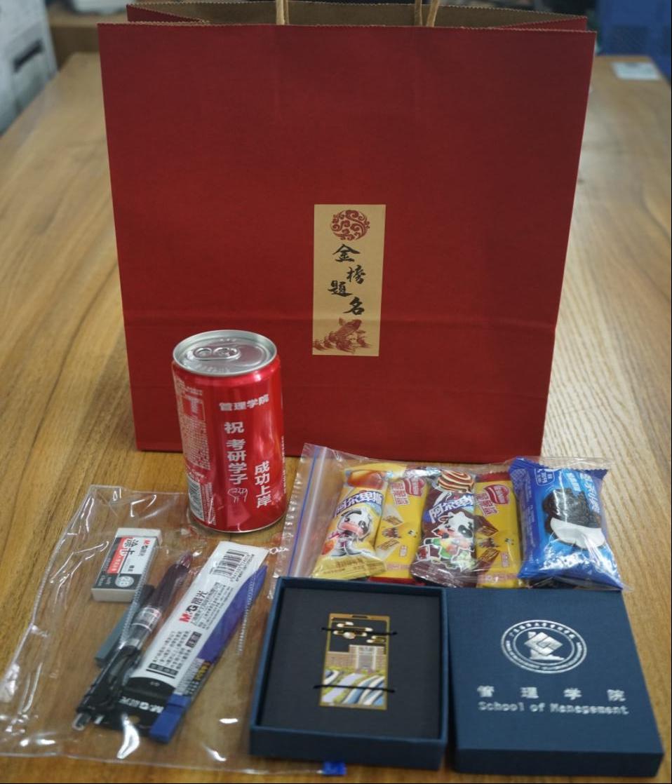 活动伊始,林彩霞一一介绍了公司考研大礼包中的定制礼品:一罐署名可乐,愿“成功上岸”;一袋零食,愿“能量满满”;一套文具,愿“文曲下凡”;一个定制书签,愿谨记院训,传承管院精神。