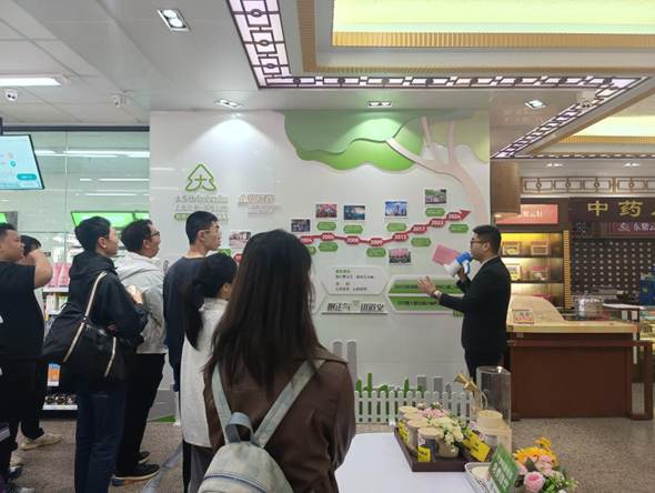 随后,师生一行走进大参林粤西最大门店(双山店),接待人员结合集团的发展历程,分别围绕商品分类陈列、特殊病种门诊、会员运营、线上问诊医院等细节展开讲解,让师生们直观了解到企业从创立到规模化发展的脉络。