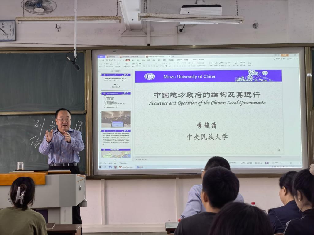 李俊清教授以宽广视野、详实数据和典型案例,系统解读了中国现行的行政区划、国务院及地方政府的机构组成、中国地方政府的运行职能及其履行等问题。不仅增长了师生的见识和学识,而且李教授还结合报告内容,寄予青年学子,鼓励他们要有家国情怀,掌握好服务人民的本领,为中华民族伟大复兴和地方治理现代化建设添砖加瓦。