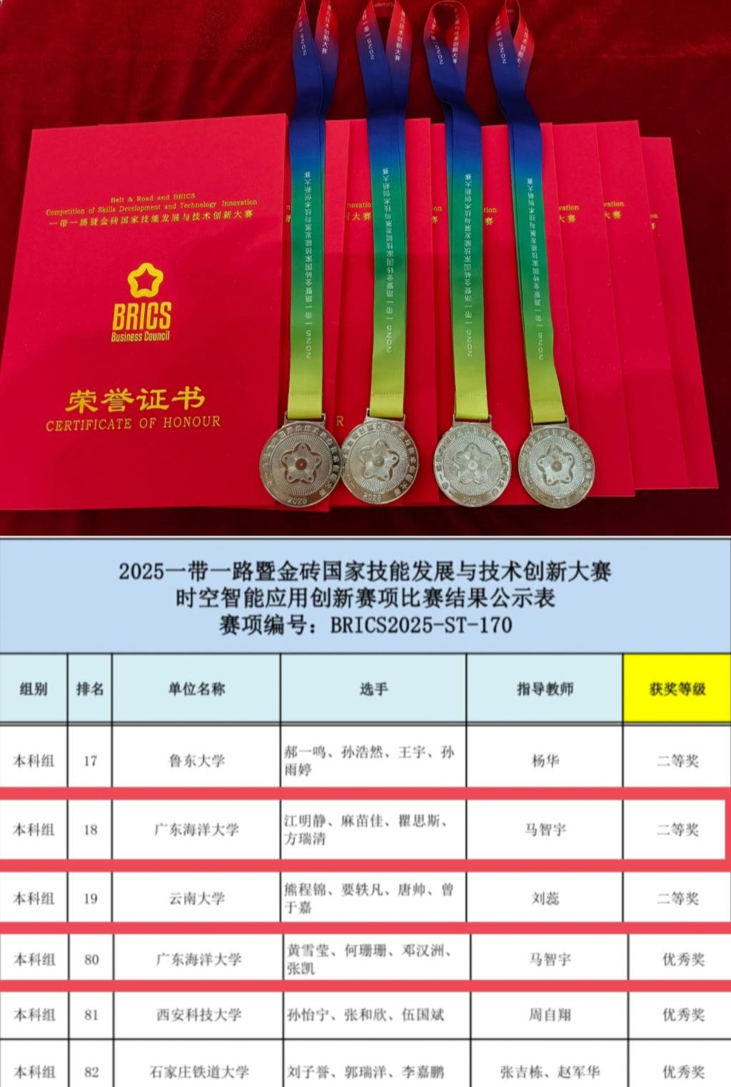 12月5-7日,2025“一带一路暨金砖国家技能发展与技术创新大赛时空智能应用创新赛项”在河北省石家庄铁路职业技术公司举办。来自全国80多所本科和高职高专院校共130多支队伍参加比赛。经过激烈角逐,公司304永利集团土地资源管理专业组建的2支队伍在马智宇老师的指导下,凭借扎实的专业知识和出色的团队写作能力荣获佳绩。其中,由304永利集团土地资源管理专业2023级员工江明静、麻苗佳、瞿思斯、方瑞清组成的代表队荣获大赛银奖;由土地资源管理专业2023级员工黄雪莹、何珊珊、邓汉洲,2024级员工张凯组成的代表队荣获优胜奖。