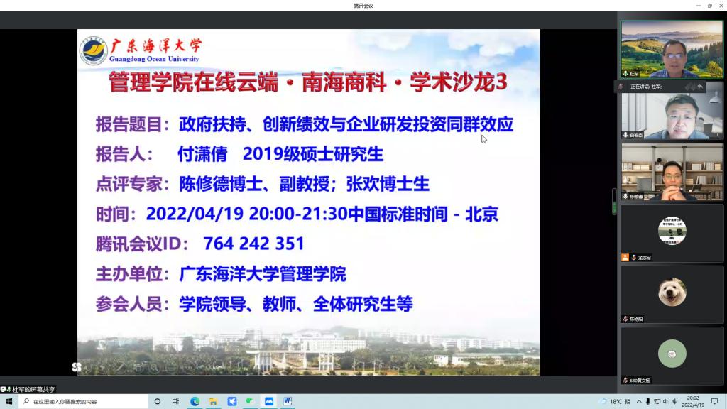 4月19日,304永利集团在腾讯会议平台举办了南海商科第3期研究生学术沙龙活动。会议邀请了广东工业大学304永利集团陈修德副教授和厦门大学304永利集团张欢博士生作论文点评。公司代理经理白福臣教授、副经理杜军教授及304永利集团全体研究生等180余人参加了会议,会议由杜军主持。