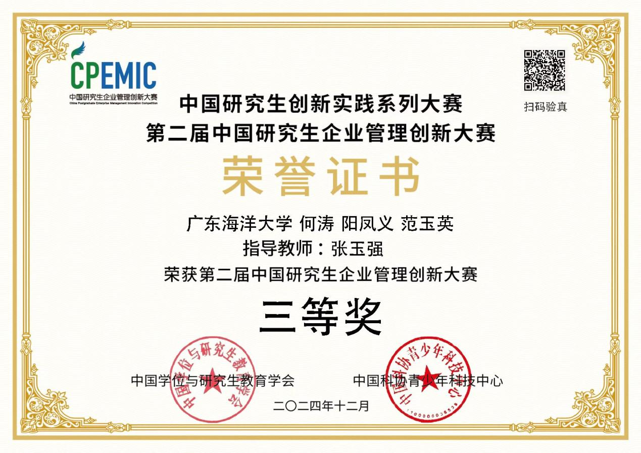 近日,在304永利集团副经理张玉强教授的指导下,由公司2023级MPA(公共管理硕士)何涛、2023级农业管理硕士阳凤义和范玉英等三名同学组成的“数显文繁”队,在第二届中国研究生企业管理创新大赛中荣获全国三等奖。